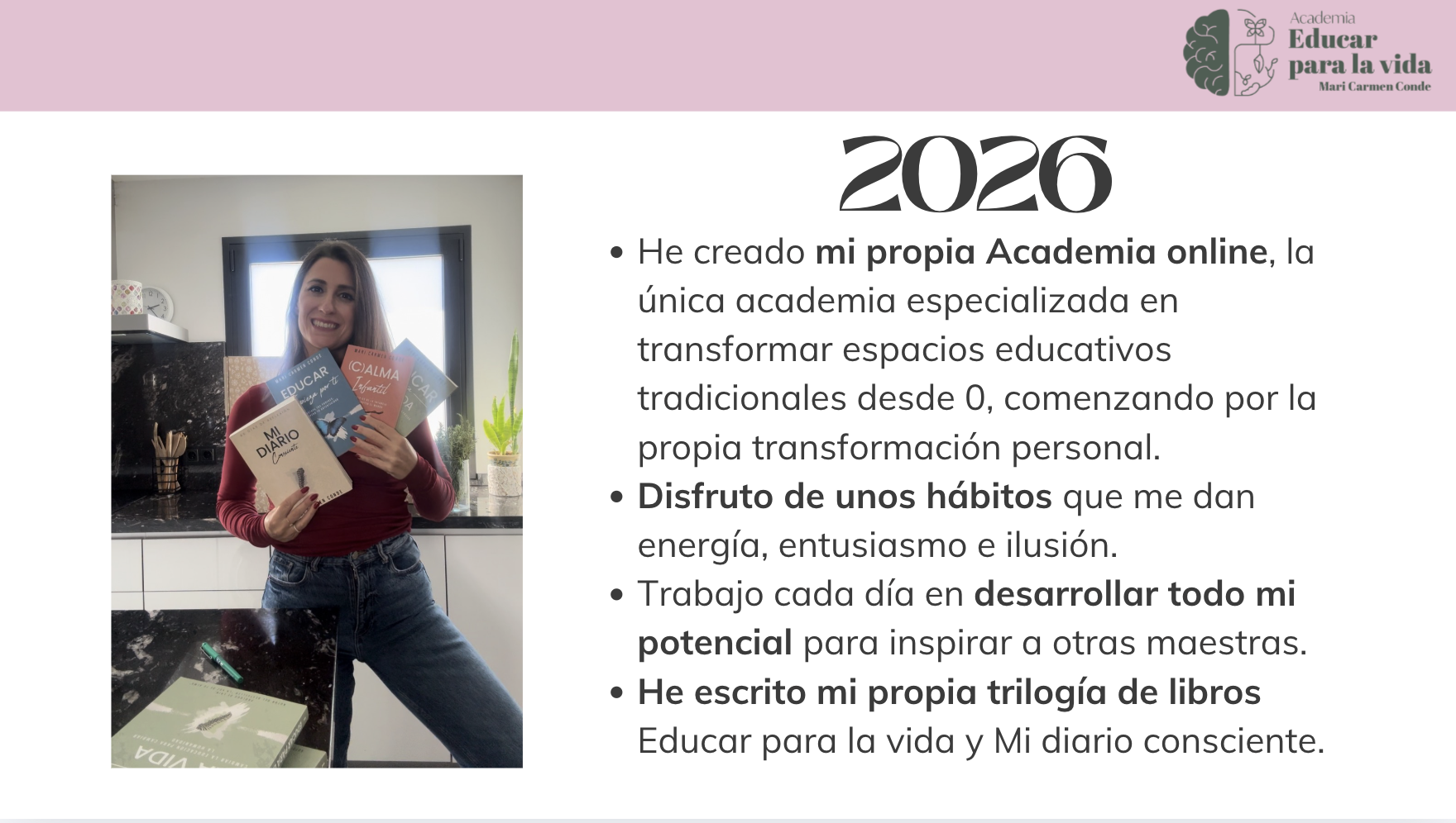 Soy Mari Carmen Conde, mentora educativa, Fundadora de la Academia Educar para la vida y creadora del método Crea tu Aula Consciente.